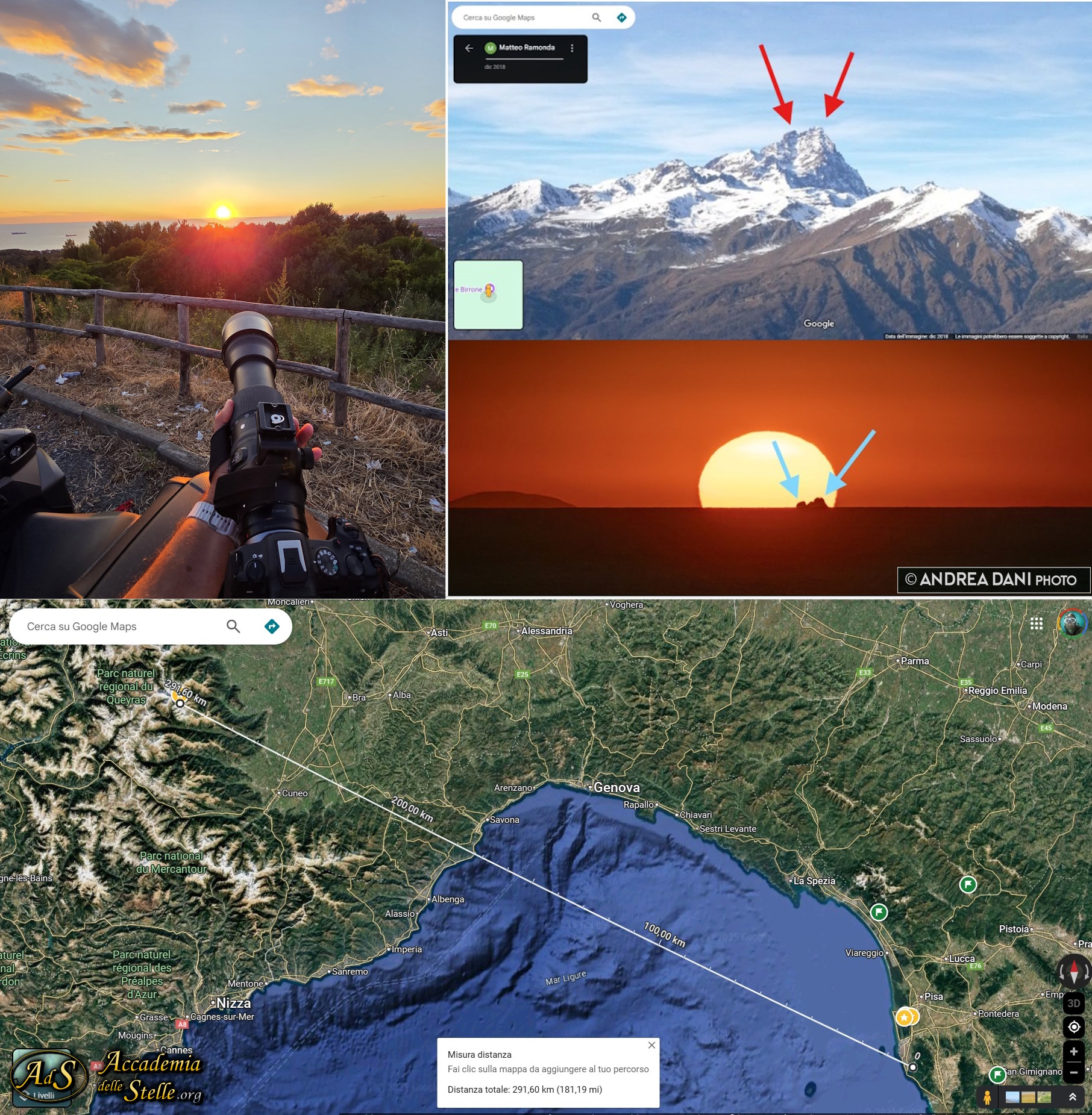 🌄 L’aiuto della rifrazione atmosferica. Anche questo aspetto è assai affascinante: se facessimo i calcoli trigonometrici, scopriremmo che l’altezza minima alla quale deve trovarsi un oggetto per spuntare sopra l’orizzonte a 292 chilometri di distanza è di quasi settemila metri, quasi il doppio dell’altezza del Monviso!