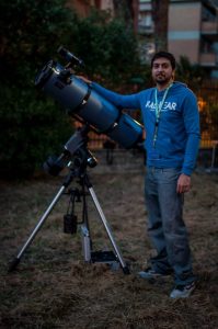 Non appena gli impegni me lo consentono, scivolo via dal fitto tappeto di luci che copre la città e scappo a cercare i cieli bui e le mie amatissime stelle. Non c’è niente al mondo che mi renda felice come l’osservazione muta e attonita del doppio ammasso nel Perseo, a medio ingrandimento, nel silenzio della notte. Sono un visualista convinto, non voglio perdere neanche un secondo di osservazione al telescopio: come potrei infatti permettere che fotoni che hanno viaggiato per milioni di anni luce colpiscano il freddo terreno e non le mie retine? Oltre a osservare, mi piace molto condividere con la gente le mie emozioni. Nulla ripaga più dello stupore provato dalle persone (specialmente bambini) che guardano al telescopio per la prima volta.