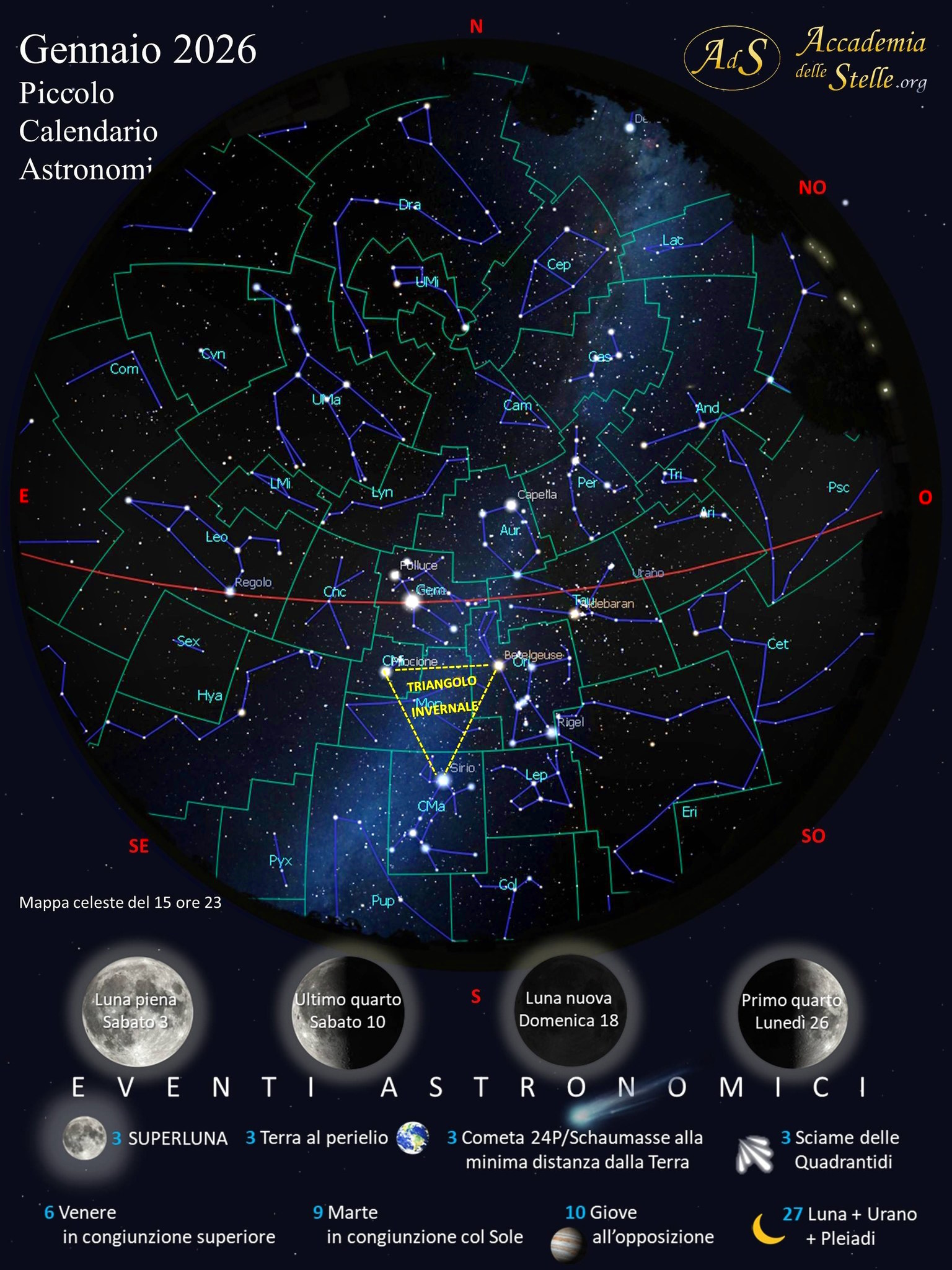 ✨ Buon 2026! E… per chi segue il cielo da un po’, sa che astronomicamente l’anno comincia sempre sotto il segno della meraviglia. Le fredde notti di gennaio sono attraversate da costellazioni imponenti, come Orione e il Toro che, oltre a esibire alcune fra le stelle più brillanti della volta celeste, custodiscono autentici tesori del cosmo: la nebulosa del Granchio, la Grande Nebulosa di Orione, la Nebulosa Testa di Cavallo, solo per citarne alcuni, abitano qui e in gennaio vanno in culminazione prima della mezzanotte. Gli asterismi del Triangolo e dell’Esagono Invernali ci deliziano gli occhi e ci guidano alla ricerca di questi e molti altri magnifici oggetti di profondo cielo. Non mancano poi nuove stelle cadenti, le Quadrantidi, messaggere di una costellazione perduta, il Quadrante Murale, che ora vive nel nome di questo sciame meteorico. Il loro picco è atteso sabato 3 gennaio, ma quella notte dà spettacolo anche la Luna, non solo piena, ma una Superluna , che ruba così la scena agli altri corpi celesti – fra cui le Quadrantidi – per le quali dovremo adottare qualche accorgimento. Sabato 3 è inoltre un giorno di massimi avvicinamenti: la Terra giunge al perielio, il punto della sua orbita più vicino al Sole, e ritorna anche una cometa, la 24P/Schaumasse; ☄️ dopo 8 anni ci passa accanto a soli 89 milioni di chilometri, anche se probabilmente non sarà più luminosa della dodicesima magnitudine e risulterà appena osservabile con telescopi di media potenza. La meraviglia continua infine con Giove, altro grande protagonista del mese! Il pianeta più maestoso del Sistema Solare va all’opposizione sabato 10 e si offre così per tutta la notte al massimo del suo fulgore. E allora che cosa aspettiamo? Piumino, cuffia, guanti e via sotto le stelle! ✨