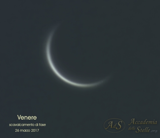 Bisogna però ricordare che la geometria delle apparizioni venusiane ha un ciclo di 8 anni terrestri, con uno sfalsamento di appena 2 giorni (questo a causa di una quasi risonanza orbitale 8/13 dei tempi di rivoluzione attorno al Sole di Venere e della Terra). Così, una congiunzione inferiore larga come quella di oggi si è verificata pure 8 anni fa, precisamente il 27 marzo 2009. Un invito all’osservazione dello scavalcamento di fase in quella occasione lo si può leggere in questa pagina di Pierpaolo Ricci. Otto anni prima, invece, durante lo scavalcamento di fase di Venere tenevo una lezione ad un liceo e mostrai ai ragazzi la sottilissima falce di Venere con un rifrattore acromatico da 120 mm. Tenetevi pronti per la replica di questo evento nel 2025!