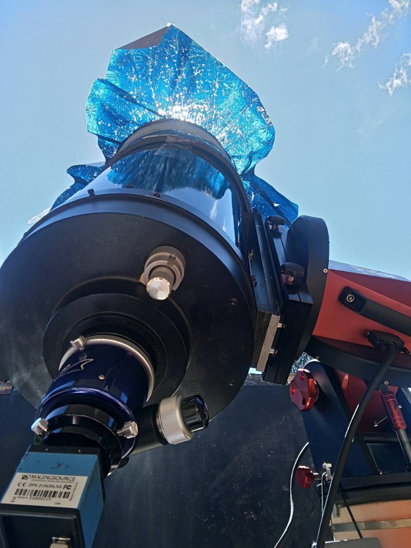 Il telescopio utilizzato per la ripresa, con la copertura anteriore in mylar riflettente per la protezione dai raggi solari.
