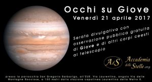 Sul modello di “Occhi su Saturno” dell’Associazione Stellaria, l’Accademia delle Stelle propone da tre anni l’evento “Occhi su Giove” in occasione del periodo di miglior visibilità del pianeta gigante del Sistema Solare. Durante la serata sarà possibile osservare il pianeta attraverso i potenti telescopi messi a disposizione dagli aderenti dell’Accademia delle Stelle, insieme ad altri oggetti celesti. Come di consueto sarà offerta anche una “guida al cielo” per scoprire costellazioni, stelle e pianeti visibili in cielo con la loro mitologia e curiosità scientifiche.
