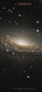 SN 2025rbs è una supernova di tipo “Ia”, cioè è l’esplosione di una nana bianca che, a causa dell’accumulo di materia da una stella compagna, supera la massa critica di stabilità trasformandosi improvvisamente in una bomba termonucleare di 1,44 masse solari!