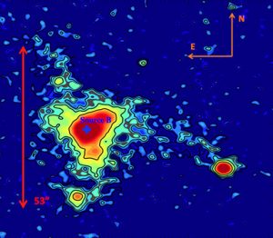 Questa immagine in falsi colori dell’ELAN MAMMOTH-1 indica forma e luminosità superficiale della nebulosa. Le frecce rosse mostrano la sua estensione spaziale. (Image credit: Figure 2 of Cai et al., Astrophysical Journal)